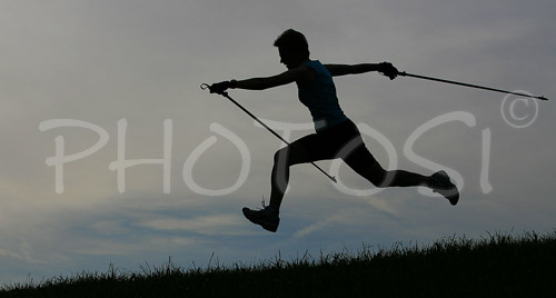 Preddvor ,Slovenia - 26.05.2006 : Nordic walker is enjoying her sport on fields near village Preddvor, Slovenia, on nice late spring afternoon. Nordic walking was first used as a summer training method by cross-country skiers. Nordic walking is one of the fastest growing recreational fitness sports in the world. Nordic walking is fitness walking with specially designed nordic walker poles and offers a very efficient, aerobic and easy way to improve your physical condition irrespective of age, sex or physical condition. Photo by: Primoz Jeroncic/PhotoSI
