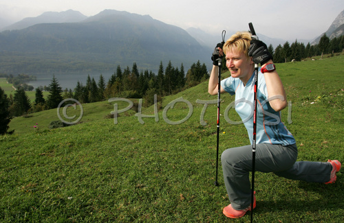 : Nordic walker is enjoying her sport on slopes above Bohinj, Slovenia. Nordic walking was first used as a summer training method by cross-country skiers. Nordic walking is one of the fastest growing recreational fitness sports in the world. Nordic walking is fitness walking with specially designed nordic walker poles and offers a very efficient, aerobic and easy way to improve your physical condition irrespective of age, sex or physical condition.