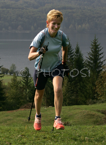 : Nordic walker is enjoying her sport on slopes above Bohinj, Slovenia. Nordic walking was first used as a summer training method by cross-country skiers. Nordic walking is one of the fastest growing recreational fitness sports in the world. Nordic walking is fitness walking with specially designed nordic walker poles and offers a very efficient, aerobic and easy way to improve your physical condition irrespective of age, sex or physical condition.