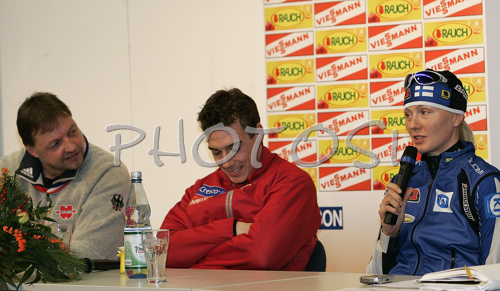 : FIS World Cup leaders Eldar Roenning of Norway (M) and Virpi Kuitunen of Finland (R) and head trainer of Germany team Jochen Behle (L) in press conference before first race of FIS Viessmann Tour de Ski. Sprint race in Munich, Germany will be, after cancelation of races in Nove Mesto, Czech, first race of FIS Viessmann Tour de Ski and will be held in Olympic stadium in Munich, Germany on 31st of December 2006.
