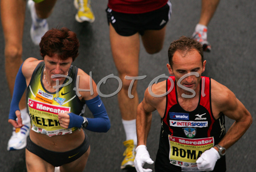 Ljubljana ,Slovenia - 28.10.2007 : Helena Javornik of Slovenia (L) and Roman Kejzar of Slovenia (R) running in 12th Ljubljana Marathon. 12th Ljubljana Marathon was held in Ljubljana, Slovenia, on 28th of October 2007. Marathon was held in difficult cold and rainy weather, so already hard track was even harder for more then 8000 runners who were competing in this years marathon and half marathon. Photo by: Primoz Jeroncic/PhotoSI