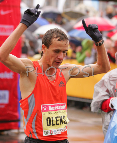 : Winner Oleksandr Sitkovskiy of Ukrain celebrating his victory in finish of 12th Ljubljana Marathon. 12th Ljubljana Marathon was held in Ljubljana, Slovenia, on 28th of October 2007. Marathon was held in difficult cold and rainy weather, so already hard track was even harder for more then 8000 runners who were competing in this years marathon and half marathon.