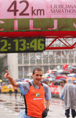 Ljubljana ,Slovenia - 28.10.2007 : Winner Oleksandr Sitkovskiy of Ukrain celebrating his victory in finish of 12th Ljubljana Marathon. 12th Ljubljana Marathon was held in Ljubljana, Slovenia, on 28th of October 2007. Marathon was held in difficult cold and rainy weather, so already hard track was even harder for more then 8000 runners who were competing in this years marathon and half marathon. Photo by: Primoz Jeroncic/PhotoSI