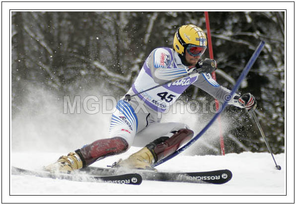 : Stephane Tissot of France skiing during first run of slalom race of Audi FIS Alpine skiing world cup in Kranjska Gora, Slovenia. Race was won by Giogio Rocca of Italy, Andre Myhrer of Sweden placed second and Benjamin Raich of Austria finished third.