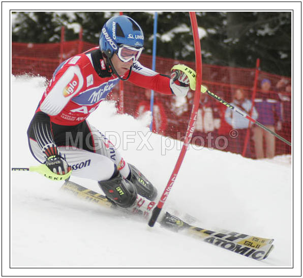 : Third placed Benjamin Raich of Austria skiing during second run of slalom race of Audi FIS Alpine skiing world cup in Kranjska Gora, Slovenia. Race was won by Giogio Rocca of Italy, Andre Myhrer of Sweden placed second and Benjamin Raich of Austria finished third.