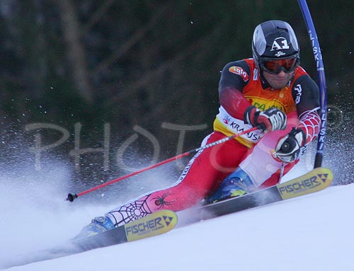 : Stephan Goergl of Austria skiing during FIS World Cup race in Kranjska Gora, Slovenia. Race was won by Benjamin Raich of Austria, Massimilian Blardone of Italy placed second, while Thomas Grandi of Canada finished third.