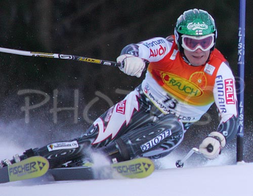 : Jukka Rajala of Finland skiing during FIS World Cup race in Kranjska Gora, Slovenia. Race was won by Benjamin Raich of Austria, Massimilian Blardone of Italy placed second, while Thomas Grandi of Canada finished third.