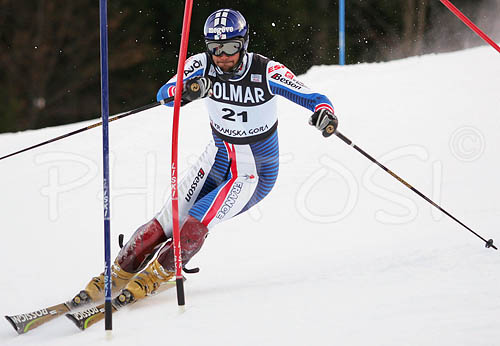 : Stephane Tissot of France skiing during FIS World Cup Slalom race in Kranjska Gora, Slovenia. Race was won by Giorgio Rocca of Italy, Thomas Grandi of Canada placed second, while Ted Ligety of USA finished third. Tissot finished 23rd.