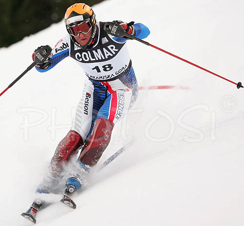 : Jean-Pierre Vidal of France skiing during FIS World Cup Slalom race in Kranjska Gora, Slovenia. Race was won by Giorgio Rocca of Italy, Thomas Grandi of Canada placed second, while Ted Ligety of USA finished third. Vidal finished 9th.