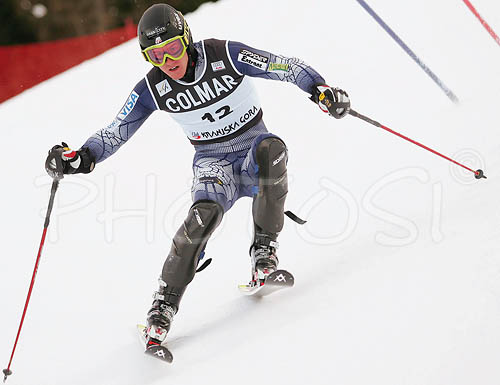 : Ted Ligety of USA skiing during FIS World Cup Slalom race in Kranjska Gora, Slovenia. Race was won by Giorgio Rocca of Italy, Thomas Grandi of Canada placed second, while Ted Ligety of USA finished third.