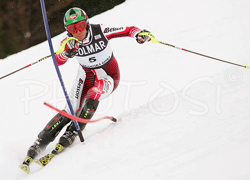 : Mario Matt of Austria skiing during FIS World Cup Slalom race in Kranjska Gora, Slovenia. Race was won by Giorgio Rocca of Italy, Thomas Grandi of Canada placed second, while Ted Ligety of USA finished third. Matt finished 27th after he made mistake in second run and lost lot of time.