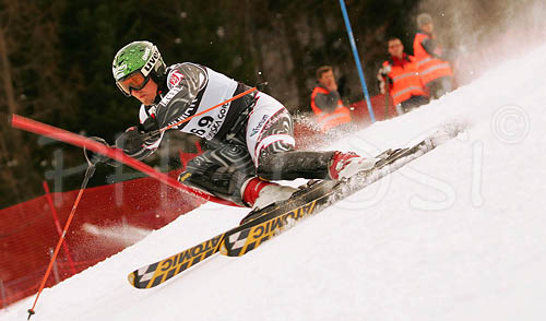 : Jouni Kaitala of Finland skiing during FIS World Cup Slalom race in Kranjska Gora, Slovenia. Race was won by Giorgio Rocca of Italy, Thomas Grandi of Canada placed second, while Ted Ligety of USA finished third. Kaitala didnt qualify for second run.