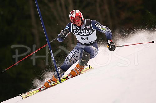 : James Cochran of USA skiing during FIS World Cup Slalom race in Kranjska Gora, Slovenia. Race was won by Giorgio Rocca of Italy, Thomas Grandi of Canada placed second, while Ted Ligety of USA finished third. Cochran finished 15th.