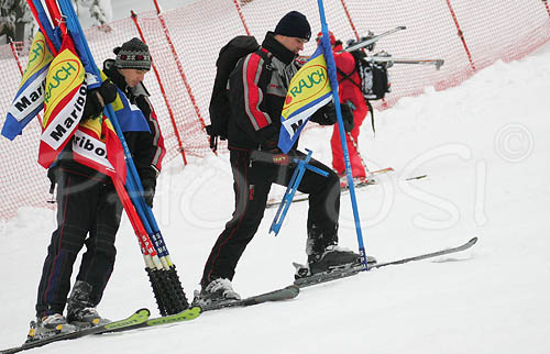: Organizers are pulling down the track after Giant slalom race of Women Audi FIS World Cup was canceled. Women Audi FIS Giant Slalom World Cup race should be held in Maribor, Slovenia, on 7th January 2006, but due to warm weather which made track to become too soft for safe racing, race was canceled.