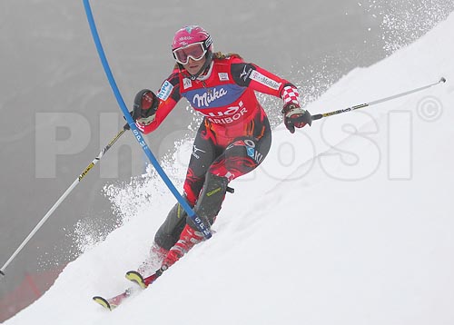 : Second placed Janica Kostelic of Croatia skiing during Women FIS World Cup Slalom race in Maribor, Slovenia. Race was won by Marlies Schild of Austria, Janica Kostelic of Croatia placed second, and Therese Borssen of Sweden finished third.