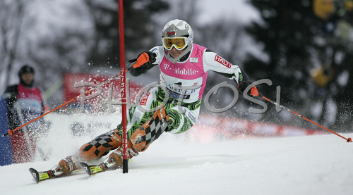 : Tanja Poutiainen of Finland skiing in first run of Women Alpine skiing slalom FIS World Cup in Zagreb, Croatia. Snow queen trophy in Zagreb, Croatia was held in Sljeme, Croatia on 4th of January 2007.