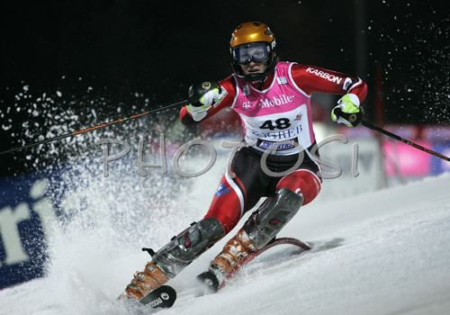 : Petra Robnik of Slovenia skiing in first run of Women Alpine skiing slalom FIS World Cup in Zagreb, Croatia. Snow queen trophy in Zagreb, Croatia was held in Sljeme, Croatia on 4th of January 2007.