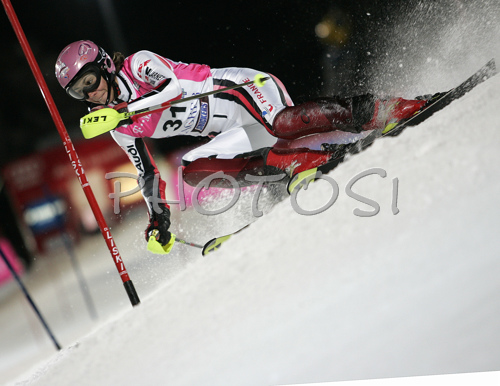 : Sandrine Aubert of France skiing in second run of Women Alpine skiing slalom FIS World Cup in Zagreb, Croatia. Snow queen trophy in Zagreb, Croatia was held in Sljeme, Croatia on 4th of January 2007.