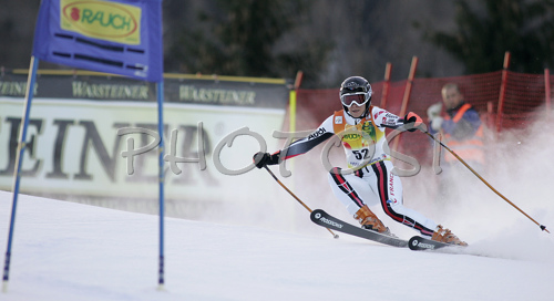 : Taina Barioz of France skiing in first run of Women Alpine skiing giant slalom FIS World Cup in Kranjska Gora, Slovenia. Golden Fox trophy was held in on 6th of January 2007 in in Kranjska Gora, Slovenia, as replacement for Maribor, Slovenia, where organizers could not prepare track due high temperatures.