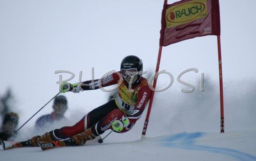 : Ana Drev of Slovenia skiing in second run of Women Alpine skiing giant slalom FIS World Cup in Kranjska Gora, Slovenia. Golden Fox trophy was held in on 6th of January 2007 in in Kranjska Gora, Slovenia, as replacement for Maribor, Slovenia, where organizers couldnt prepare track due high temperatures.