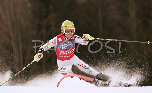 : Marlies Schild of Austria skiing in first run of Women Alpine skiing slalom FIS World Cup in Kranjska Gora, Slovenia. Golden Fox trophy was held in on 7th of January 2007 in in Kranjska Gora, Slovenia, as replacement for Maribor, Slovenia, where organizers couldnt prepare track due high temperatures.