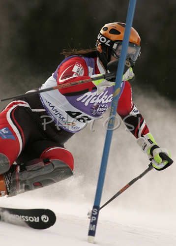 : Petra Robnik of Slovenia skiing in first run of Women Alpine skiing slalom FIS World Cup in Kranjska Gora, Slovenia. Golden Fox trophy was held in on 7th of January 2007 in in Kranjska Gora, Slovenia, as replacement for Maribor, Slovenia, where organizers couldnt prepare track due high temperatures.