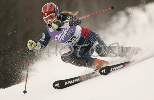 : Kaylin L Richardson of USA skiing in second run of Women Alpine skiing slalom FIS World Cup in Kranjska Gora, Slovenia. Golden Fox trophy was held in on 7th of January 2007 in in Kranjska Gora, Slovenia, as replacement for Maribor, Slovenia, where organizers couldnt prepare track due high temperatures.