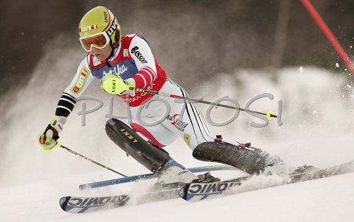 : Winner Marlies Schild of Austria skiing in second run of Women Alpine skiing slalom FIS World Cup in Kranjska Gora, Slovenia. Golden Fox trophy was held in on 7th of January 2007 in in Kranjska Gora, Slovenia, as replacement for Maribor, Slovenia, where organizers couldnt prepare track due high temperatures.