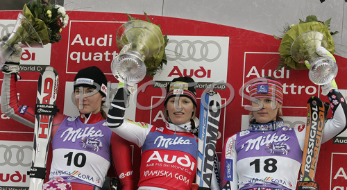 : Winner Marlies Schild of Austria (M), second placed Sarka Zahrobska of Czech (L) and third placed Veronika Zuzulova of Slovakia (R) celebrating their medals won in Women Alpine skiing slalom FIS World Cup in Kranjska Gora, Slovenia. Golden Fox trophy was held in on 7th of January 2007 in in Kranjska Gora, Slovenia, as replacement for Maribor, Slovenia, where organizers couldnt prepare track due high temperatures.