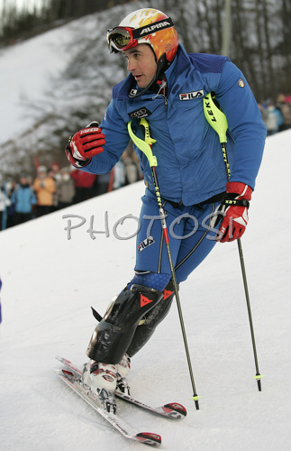 : Giorgio Rocca of Italy inspecting course before first run of Men Alpine skiing slalom FIS World Cup in Schladming, Austria. Men slalom FIS Alpine skiing World Cup was held on 30th of January 2007 in Schladming, Austria.