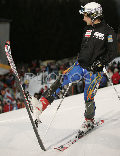 : Markus Larsson of Sweden inspecting course before first run of Men Alpine skiing slalom FIS World Cup in Schladming, Austria. Men slalom FIS Alpine skiing World Cup was held on 30th of January 2007 in Schladming, Austria.