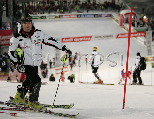 : Skiers inspecting course before start of first run of Men Alpine skiing slalom FIS World Cup in Schladming, Austria. Men slalom FIS Alpine skiing World Cup was held on 30th of January 2007 in Schladming, Austria.Photo by: Primoz Jeroncic/PhotoSI
