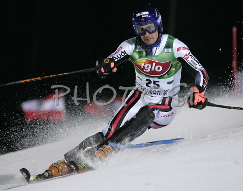 : Jean-Baptiste Grange of France skiing in first run of Men Alpine skiing slalom FIS World Cup in Schladming, Austria. Men slalom FIS Alpine skiing World Cup was held on 30th of January 2007 in Schladming, Austria.