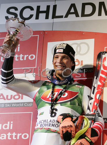 : Winner Benjamin Raich of Austria celebrating his victory in Men Alpine skiing slalom FIS World Cup in Schladming, Austria. Men slalom FIS Alpine skiing World Cup was held on 30th of January 2007 in Schladming, Austria.