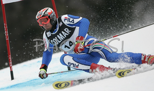 : Alberto Schieppati of Italy skiing in first run of Men Alpine skiing giant slalom FIS World Cup in Kranjska Gora, Slovenia. Men giant slalom FIS Alpine skiing World Cup was held on 3rd of March 2007 in Kranjska Gora, Slovenia.