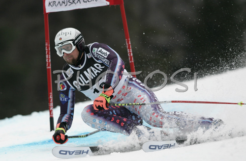 : Marco Buechel of Liechtenstein skiing in first run of Men Alpine skiing giant slalom FIS World Cup in Kranjska Gora, Slovenia. Men giant slalom FIS Alpine skiing World Cup was held on 3rd of March 2007 in Kranjska Gora, Slovenia.
