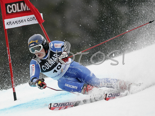 : Marc Berthod of Switzerland skiing in first run of Men Alpine skiing giant slalom FIS World Cup in Kranjska Gora, Slovenia. Men giant slalom FIS Alpine skiing World Cup was held on 3rd of March 2007 in Kranjska Gora, Slovenia.