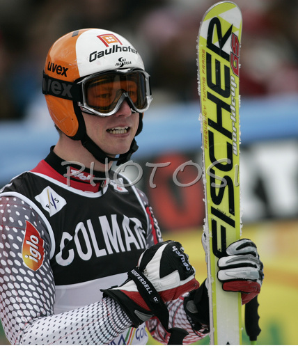 : Hannes Reichelt of Austria celebrating good run after finishing second run of Men Alpine skiing giant slalom FIS World Cup in Kranjska Gora, Slovenia. Men giant slalom FIS Alpine skiing World Cup was held on 3rd of March 2007 in Kranjska Gora, Slovenia.