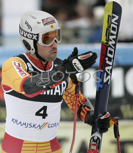: Francois Bourque of Canada celebrating his third place after finishing second run of Men Alpine skiing giant slalom FIS World Cup in Kranjska Gora, Slovenia. Men giant slalom FIS Alpine skiing World Cup was held on 3rd of March 2007 in Kranjska Gora, Slovenia.