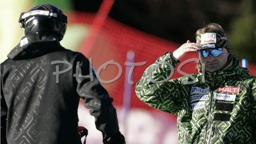 : Kalle Palander of Finland (L) and head coach of Finnish team Christian Leitner (R) inspecting course of first run of Men Alpine skiing slalom FIS World Cup in Kranjska Gora, Slovenia. Men slalom FIS Alpine skiing World Cup was held on 4th of March 2007 in Kranjska Gora, Slovenia.