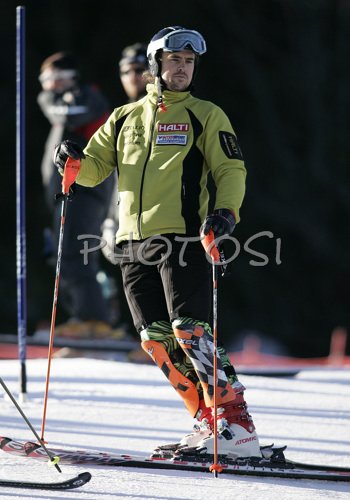 : Jukka Leino of Finland inspecting course of first run of Men Alpine skiing slalom FIS World Cup in Kranjska Gora, Slovenia. Men slalom FIS Alpine skiing World Cup was held on 4th of March 2007 in Kranjska Gora, Slovenia.