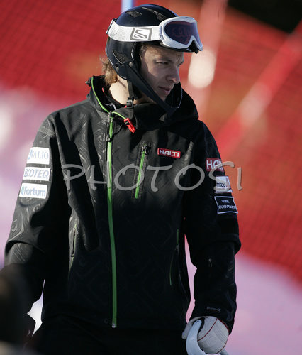 : Tuukka Kaukoniemi of Finland inspecting course of first run of Men Alpine skiing slalom FIS World Cup in Kranjska Gora, Slovenia. Men slalom FIS Alpine skiing World Cup was held on 4th of March 2007 in Kranjska Gora, Slovenia.