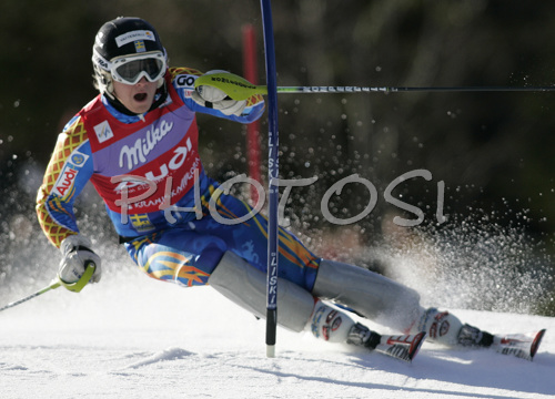 : Jens Byggmark of Sweden skiing in first run of Men Alpine skiing slalom FIS World Cup in Kranjska Gora, Slovenia. Men slalom FIS Alpine skiing World Cup was held on 4th of March 2007 in Kranjska Gora, Slovenia.