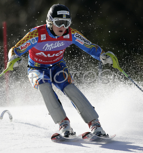 : Jens Byggmark of Sweden skiing in first run of Men Alpine skiing slalom FIS World Cup in Kranjska Gora, Slovenia. Men slalom FIS Alpine skiing World Cup was held on 4th of March 2007 in Kranjska Gora, Slovenia.