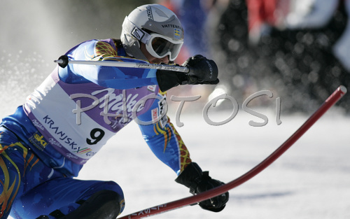 : Andre Myhrer of Sweden skiing in first run of Men Alpine skiing slalom FIS World Cup in Kranjska Gora, Slovenia. Men slalom FIS Alpine skiing World Cup was held on 4th of March 2007 in Kranjska Gora, Slovenia.