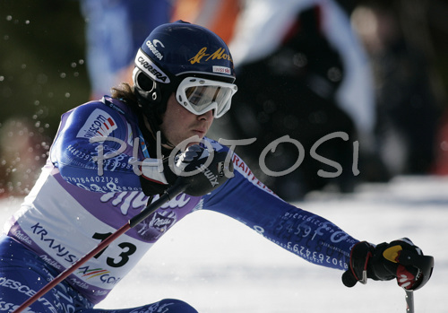 : Marc Berthod of Switzerland skiing in first run of Men Alpine skiing slalom FIS World Cup in Kranjska Gora, Slovenia. Men slalom FIS Alpine skiing World Cup was held on 4th of March 2007 in Kranjska Gora, Slovenia.