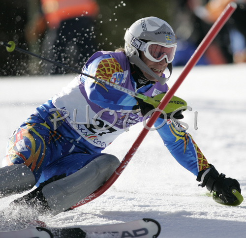 : Johan Brolenius of Sweden skiing in first run of Men Alpine skiing slalom FIS World Cup in Kranjska Gora, Slovenia. Men slalom FIS Alpine skiing World Cup was held on 4th of March 2007 in Kranjska Gora, Slovenia.