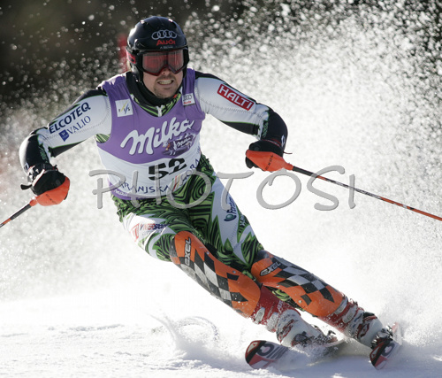 : Jukka Leino of Finland skiing in first run of Men Alpine skiing slalom FIS World Cup in Kranjska Gora, Slovenia. Men slalom FIS Alpine skiing World Cup was held on 4th of March 2007 in Kranjska Gora, Slovenia.
