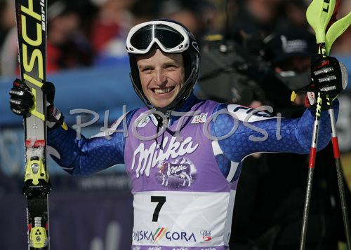 : Manfred Moelgg of Italy celebrating his success in Men slalom FIS Alpine skiing World Cup race in Kranjska Gora, Slovenia. Men slalom FIS Alpine skiing World Cup race was held in Kranjska Gora, Slovenia on 4th of March 2007.