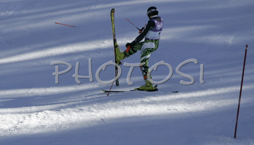 : Kalle Palander of Finland braking his pole in anger after falling in second run of Men slalom FIS Alpine skiing World Cup race in Kranjska Gora, Slovenia. Men slalom FIS Alpine skiing World Cup race was held in Kranjska Gora, Slovenia on 4th of March 2007.
